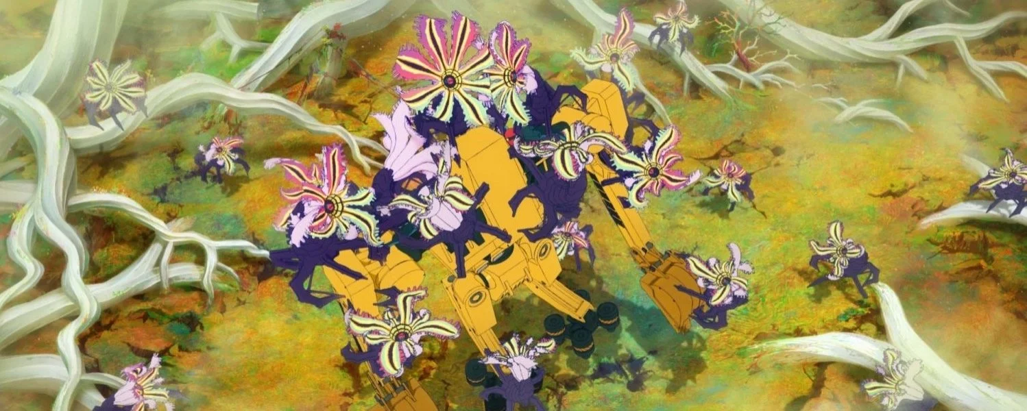 The vibrant, kaleidoscopic colours and lush backgrounds Akimoto deploys here are the polar opposite of Liman’s tech-heavy, ash and military metal near-monochrome, so when it starts with Yasuhiro Maeda’s pounding, ominous score and the bright arrival of the invading Darol on Earth, it’s hard not to be mesmerised immediately. The Darol, a tree-like alien creature, lands (plants?) in Japan, unleashing hell and drawing ordinary citizens into an existential fight. One of those is Rita (Ai Mikami, Kokuho), a sullen, solitary young woman with orange hair and a distaste for complete meals and small talk. She’s part of the crew that’s attempting to prune the branches of the mysterious Darol that’s been growing for a year. One day it suddenly sprouts flowers – spores? fruit? – blossoms fully and murders everyone it sees, including Rita. Then she wakes up the next day, at 7:03am and assumes she had a nightmare until the day repeats exactly as it did before. She does this 92 times before she meets Keiji (Natsuki Hanae, Demon Slayer: Kimetsu no Yaiba Infinity Castle), a classic 90-pound weakling with a genius mind for software engineering. He’s caught in the time loop too.