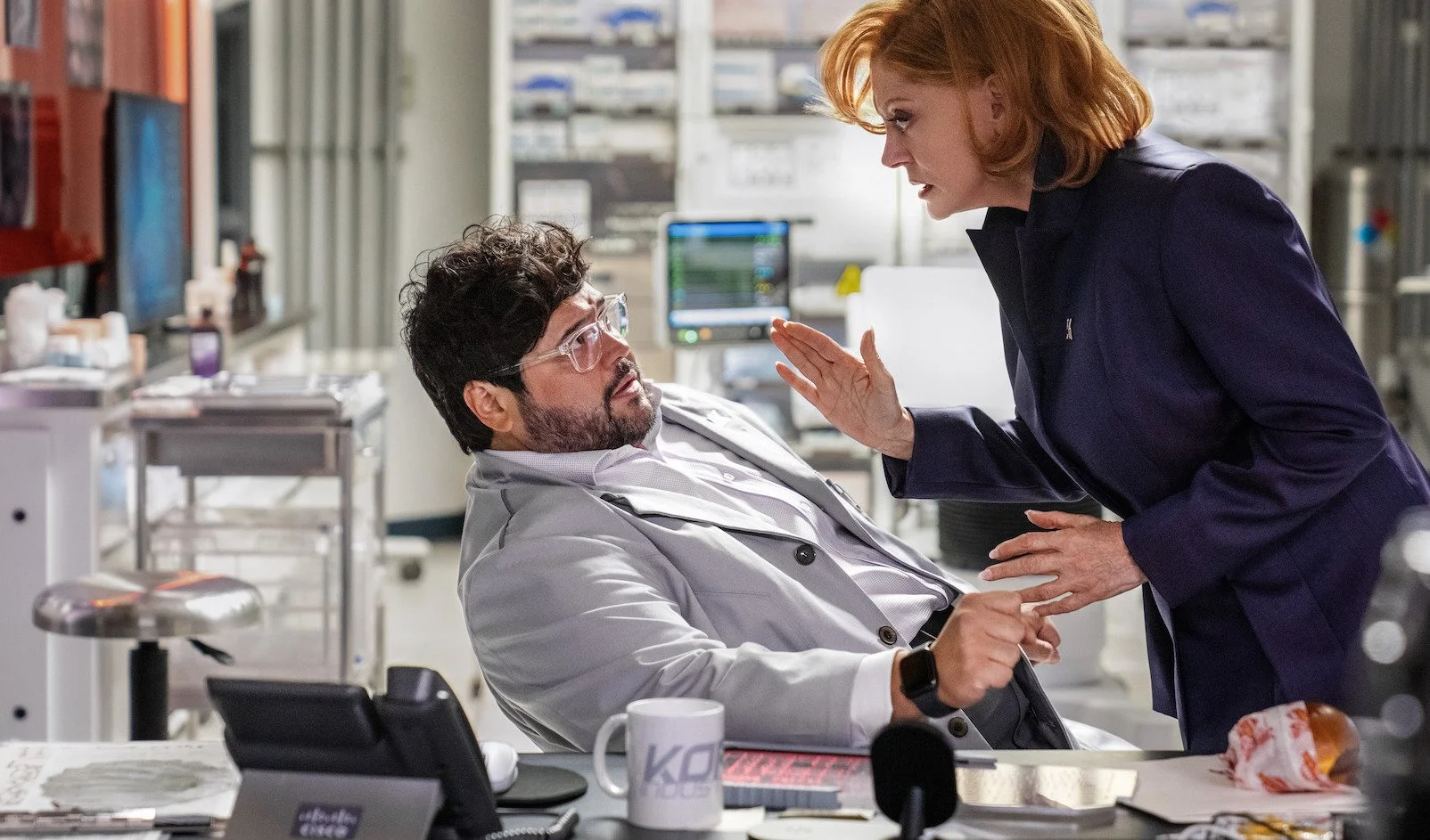 The (again, origin) story begins with fresh college grad Jaime Reyes (Xolo Maridueña, Cobra Kai) going home to Palmera City, the first Reyes ever to do so – and evidently he went to Gotham U. Eventually, over dinner, his sister Milagro (Belissa Escobedo, fantastic) tells him the family’s lost their auto body business and is about to lose its house because of the Tony Stark-ish Victoria Kord (Susan Sarandon), an industrialist and developer who’s “gentrifying” the Reyes’ oceanfront Edge Keys neighbourhood. His dad Alberto (Damián Alcázar, Narcos) and Nana (Adriana Barraza) refuse to be cowed and are fully on the “we’ll find our way” side, while Milagro, Jaime’s mother Rocio (Elpidia Carrillo), and paranoid uncle Rudy (George Lopez) are less optimistic and have nothing but contempt for Kord Industries, which, admittedly, is hilariously sinister.