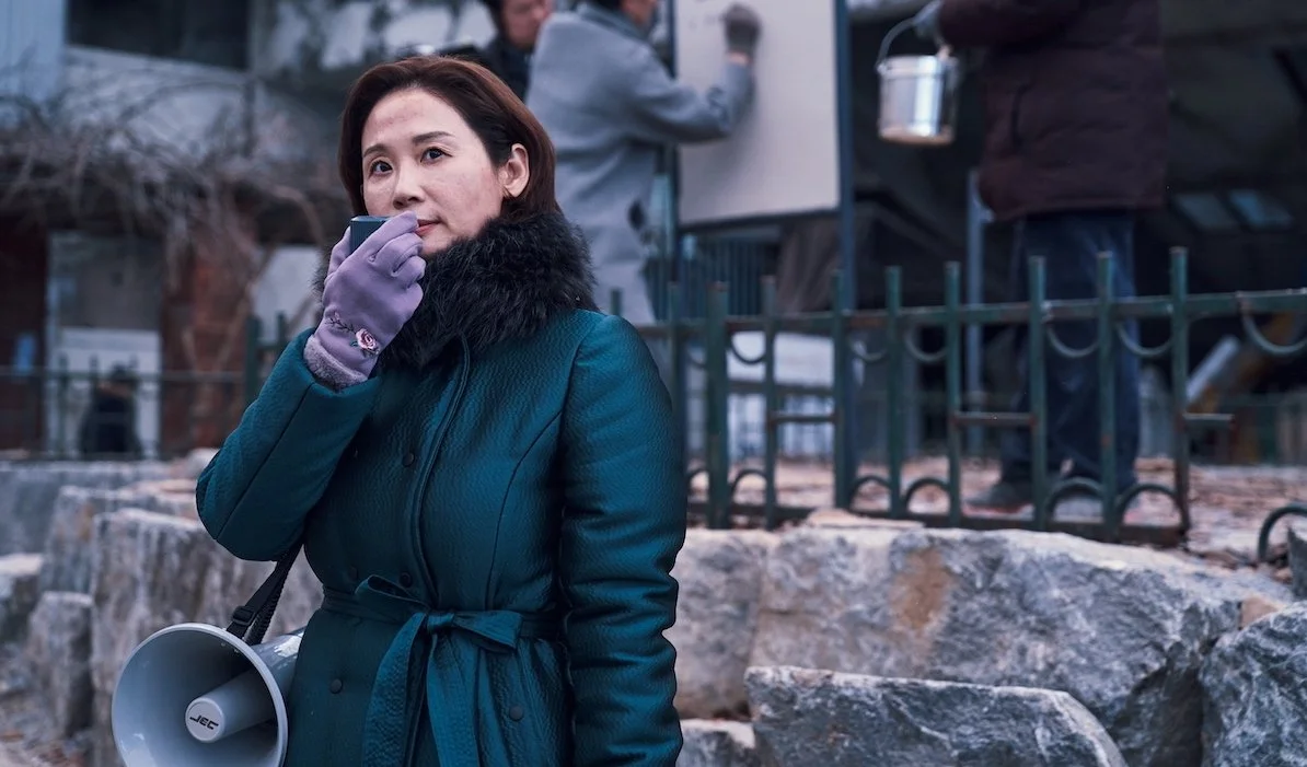 Concrete Utopia begins in the aftermath of a massive, massive, massive earthquake that has reduced Seoul to rubble – with the exception of a single tower at the Hwang Gung Apartments. It’s impossible to say but weeks, perhaps months have gone by, and not single city service has shown up; everyone’s got the feeling they’re gone too. The water and power are off, food is in short supply, and random survivors from other parts of the city are clamouring to get into the only safe haven and out of the winter. This naturally leads to squatters, and friction between residents and “outsiders”, and the eventual election of Young-tak (Lee Byung-hun, going all-in on the character) as the residents’ de facto president. He sets up committees to evict the interlopers, and then for some kind of social services for medical care, food rationing – and policing. Uh oh. The committee includes a young couple that had been struggling to get by, civil servant Min-sung (Park Seo-joon, Parasite) and his wife Myung-hwa (Park Bo-young), a nurse, as well as Young-tak’s biggest booster, Geum-ae (Kim Sun-young, Broker, chilling). When high school student Hye-won (Park Ji-hu, House of Hummingbird) stumbles home months later, she throws a wrench into Young-tak’s fervent defence of the oasis Hwang Gung has become, and everything eventually goes to shit.