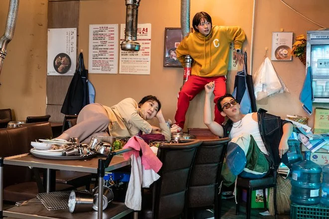 To be fair (insert Letterkenny echo here), Kang’s decision to go OTT and overtly artificial in his anti-physics SFX for The Five’s heroic antics was smart. If you don’t have Marvel money, don’t try; even Marvel fucks that up on the regular now. There are a couple genuine chuckles to be had, and a high speed chase on Sun-nyeo’s Yakult cart and a punch-up between Won-seo’s dad – that’s actually Won-seo – and some thugs sent by Seo are inspired. The cart chase is scored to one of the film’s more ear-catching needle drops in “Never Gonna Give You Up”, a stab at making Rick (Astley) Rolling happen again, which runs alongside Corey Hart’s (!) supremely ’80 “Sunglasses at Night” (only tolerable for its now-Elbows Up-ness) and Sister Sledge’s disco anthem “We Are Family” because of course. Still doesn’t make it better.